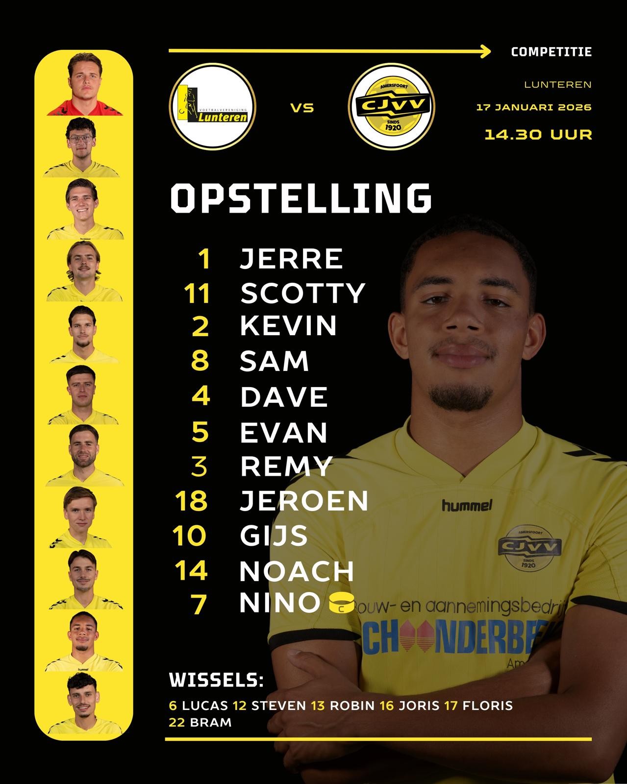 Slechts een helft mag CJVV hopen op een resultaat in en tegen Lunteren. Al na 2 minuten verschijnt Noach Ayide alleen voor de Lunteren doelman en heeft de kans om de Amersfoorters op een voorsprong te zetten. De goalie van de thuisploeg redt echter en zorgt er hiermee mede voor dat Lunteren na de rust gestaag en probleemloos kan uitlopen naar de 3-0 overwinning. De doelman moet ook nog handelend optreden bij een lastige stuit op een vrije trap van Gijs Wobbes en ook Lunteren krijgt nog twee halve kansen in de eerste helft.