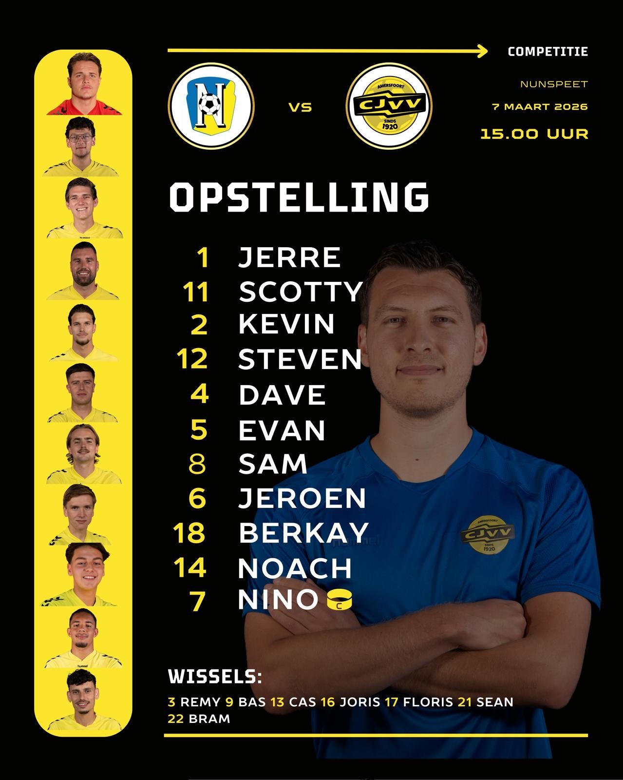 CJVV mist op het middenveld Hicham Harchaoui door een schorsing, ook Bas Wobbes is nog niet geheel fit na een breuk in zijn middenvoetsbeentje. Daardoor bezetten jongelingen Jeroen den Uyl en Berkay Sari het middenveld van CJVV, zij zullen dit naar behoren doen en spelen beiden een prima wedstrijd.
