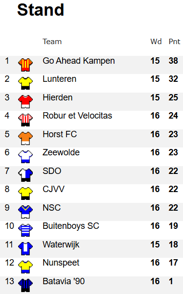 CJVV speelt volgende week tegen het geplaagde Batavia uit Lelystad. Deze club was aan het begin van dit seizoen op sterven na dood en kon ternauwernood worden gered. De ploeg bungelt met 1 punt onderaan de ranglijst en degradatie lijkt onafwendbaar voor de eens zo ambitievolle club. Zaak voor CJVV om “gewoon” 3 punten aan het puntentotaal toe te voegen volgende week, want deze zullen nog hard nodig zijn in het vervolg van de competitie. De komende weken volgen twee thuiswedstrijden, na Batavia zal Robus et Velocitas de degens kruisen met ons vlaggenschip. Hier tussendoor zal een vrij weekend zijn in verband met oneven aantal ploegen in de competitie.