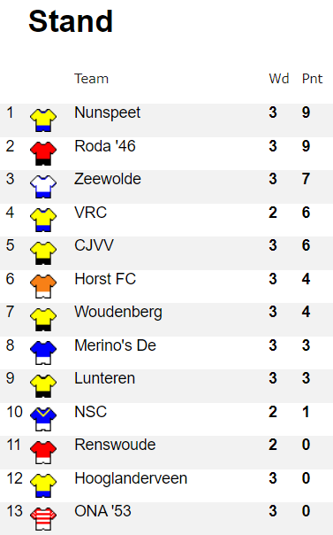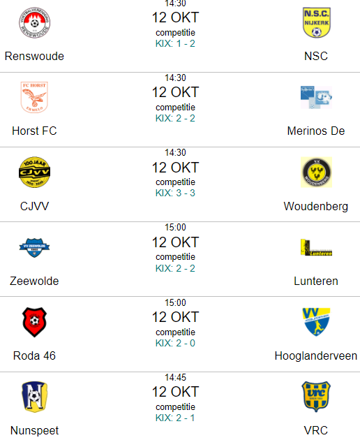 Een teleurstellend resultaat na twee totaal verschillende helften, maar goed om te zien dat de spelers snel weer overgingen tot de orde van de dag en met een biertje op het dakterras uitkijken naar de wedstrijd van komende zaterdag, waar VV Woudenberg wacht. Zij werden twee jaar geleden kampioen bij CJVV in de tweede klasse en zijn vorig jaar weer gedegradeerd vanuit de eerste klasse. Een aantal oudgedienden zijn gestopt bij Woudenberg maar dit is nog niet terug te zien in de resultaten, de ploeg speelde gelijk tegen kampioenskandidaat Zeewolde en verloor nipt van andere kampioenskandidaat Roda. Hooglanderveen werd met 2-0 verslagen en daardoor staat Woudenberg met 4 punten in de middenmoot van 2G. CJVV neemt plek 5 in met 6 punten uit 3 wedstrijden.